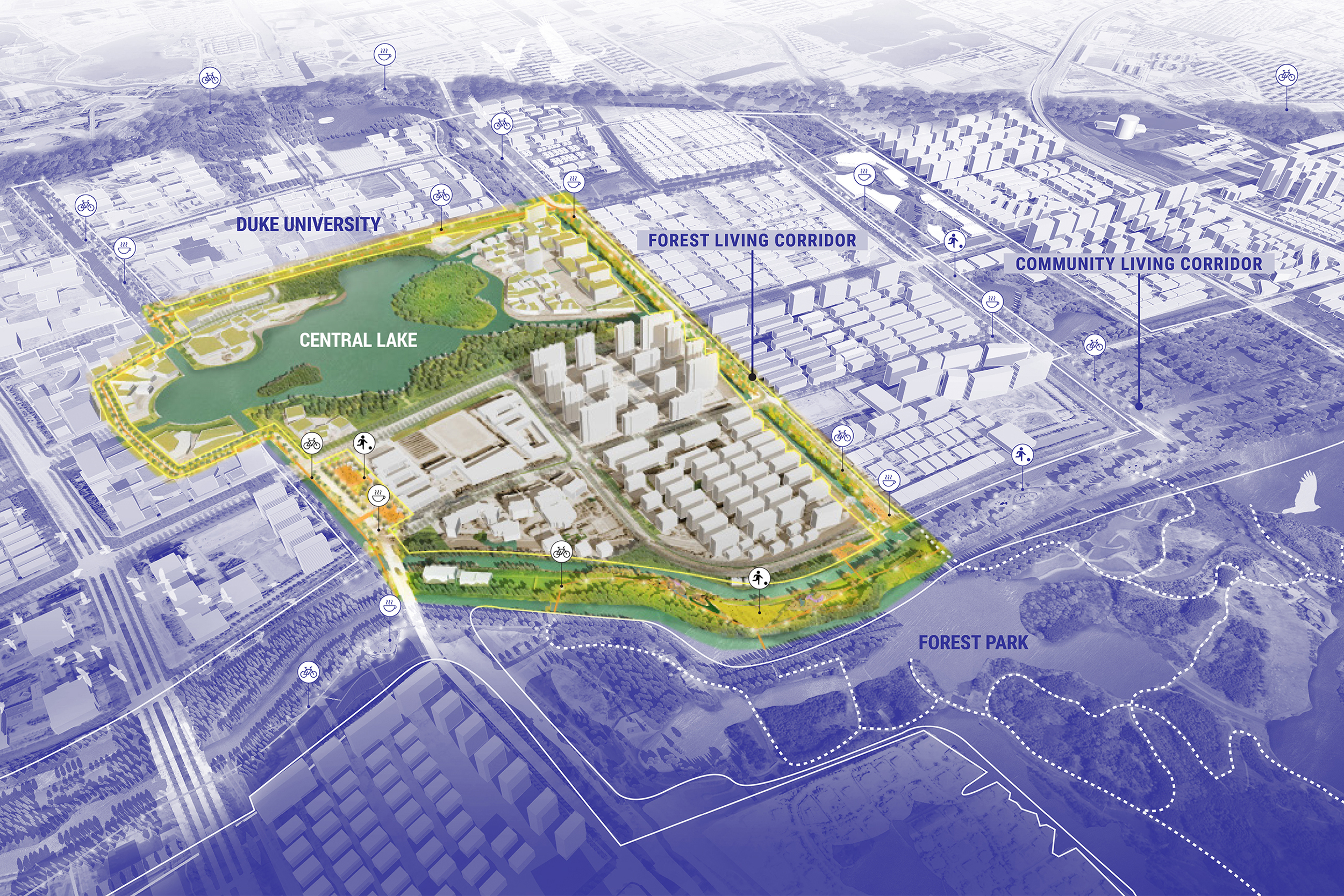不同尺度的城市公園通過建議一系列活躍的活動來打造一個全區的綜合公園系統。這些公園考慮位置和環境的便利性,分別為各年齡段的居民提供服務。在校園區,規劃了運動公園、校園廣場、與啤酒花園等功能,為學生和科技工作者提供了社交和促進創新討論的空間。在住宅區附近則規劃了遊戲場、寵物公園及漫步水岸等。在此城市框架下,通過慢行系統和設施節點進駐,進一步服務所有社區不同世代的居民。慢行系統策略性的為所有社區提供了與公共設施的連接機會,居民們可以很容易的到達街道、公園、水濱。便利設施節點被配置在策略性的位置,提供休憩、社會參與和連接到分支路線的機會。不同規模的服務配套設施節點,不僅服務行人和自行車騎士,也保持彈性提供服務給想換乘交通工具的使用者。