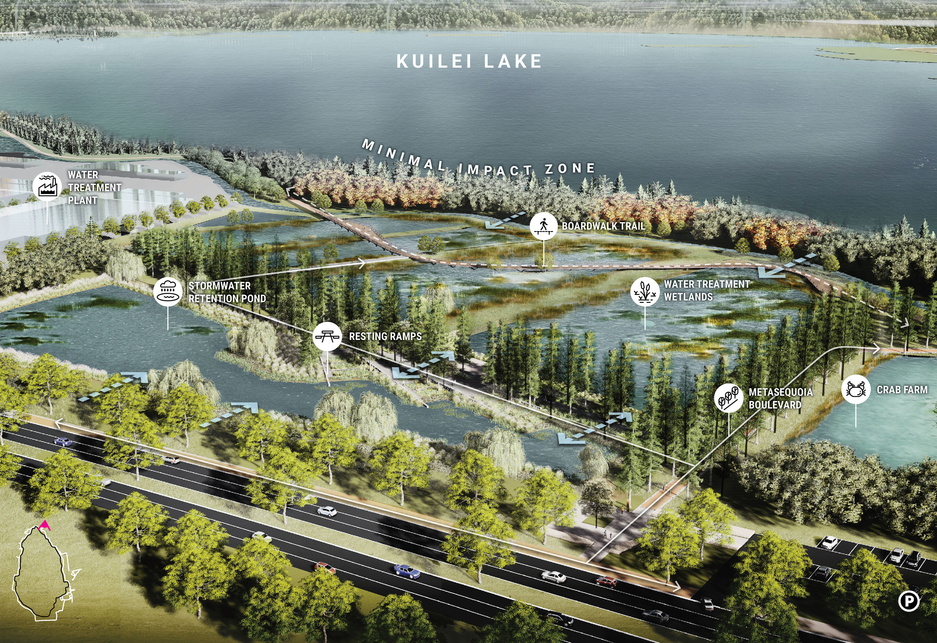 傀儡湖是昆山西区仅存的农场、村庄和水产养殖用地,具有极高的文化、生态、教育和休闲价值。以生态和水处理作为傀儡湖的优先事项,绿廊慢行系统的愿景是保护和连接昆山湖区的最后一个原始生态与生活风貌保留区,供昆山湖区的后代享用。